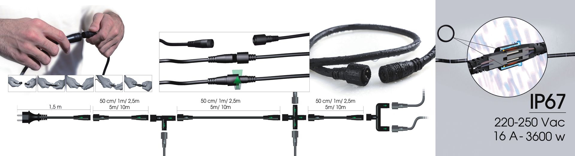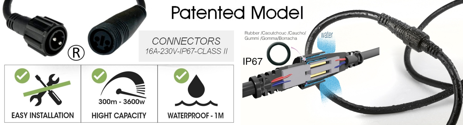 Grazie ai connettori 16A-230V-IP67-CLASSII, puoi assemblare la tua rete con un semplice gesto; questo connettore è protetto e utilizzato da molti anni.