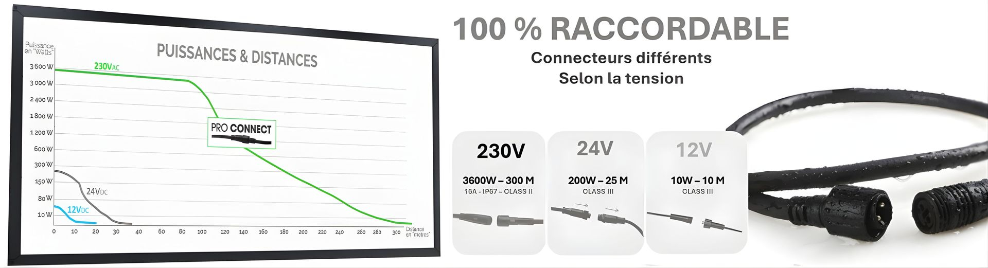 È possibile collegare fino a 300 m di alimentazione a 230 V a una singola presa. Anche i circuiti secondari a 24 V e 12 V sono dotati di connettori, semplificando l'installazione.