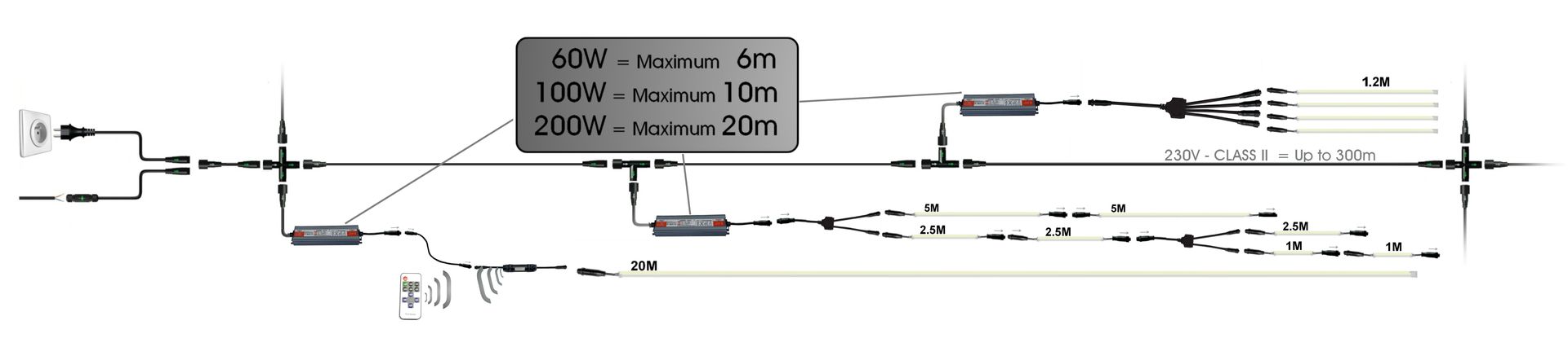 60w/100w/200w selon les longueurs de bandeaux que vous souhaitez utiliser.